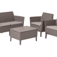 Комплект имеет красивые округлые линии и современный вид. На нем с полным комфортом могут расположиться четыре человека. Комплектация: 2-местный диван, два кресла, подушки на сиденья, столик с отделением для хранения небольших вещей.